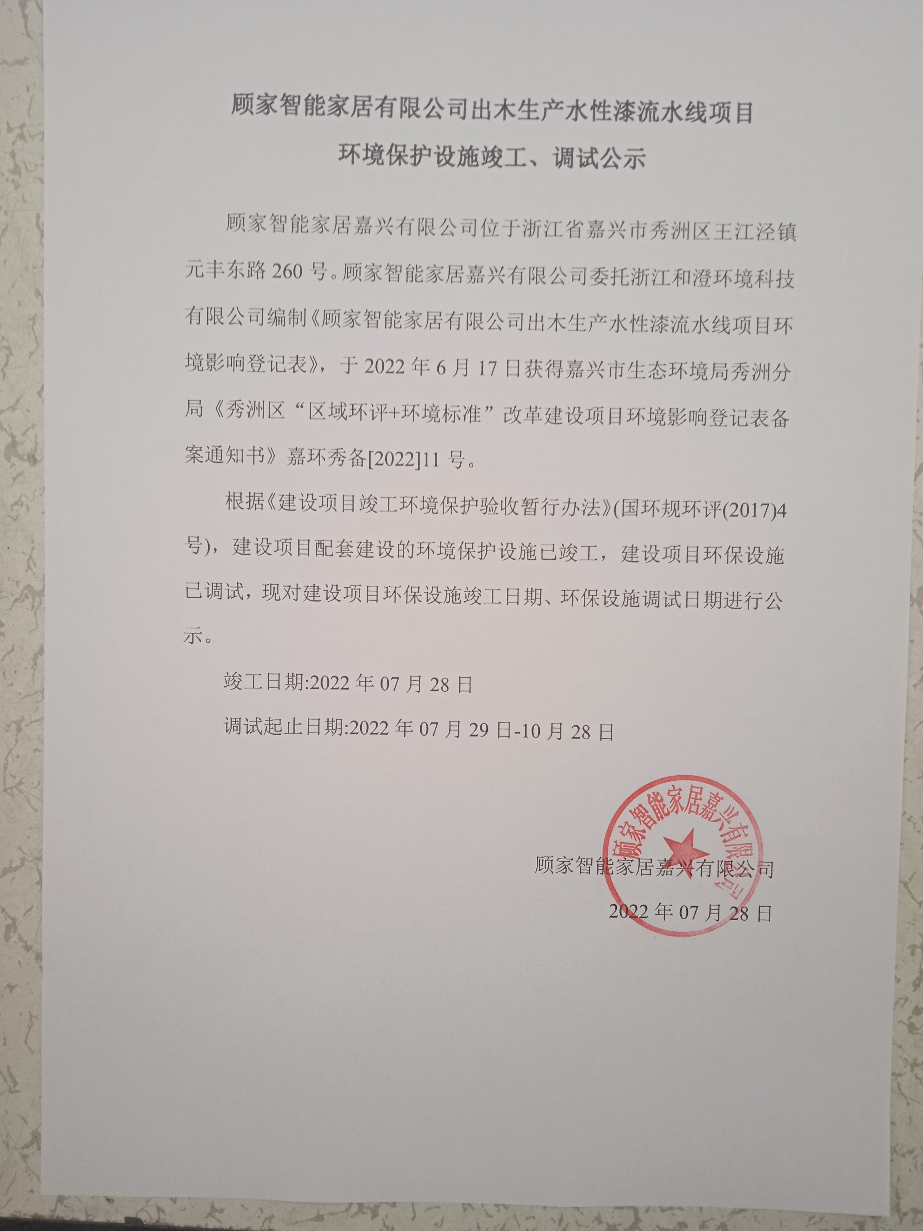 顧家智能家居有限公司出木生產(chǎn)水性漆流水線項(xiàng)目環(huán)保設(shè)施竣工、調(diào)試公示