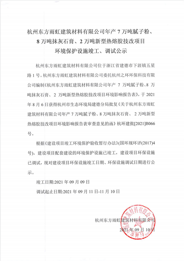 杭州東方雨虹建筑材料有限公司年產 7 萬噸膩子粉、8 萬噸抹灰石膏、 2 萬噸新型熱熔膠技改項目環保設施竣工、調試公示.jpg.jpg
