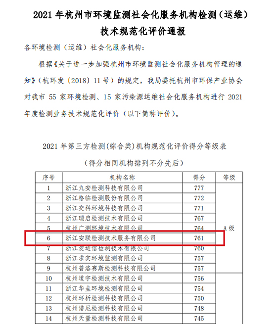 安聯(lián)檢測在“2021年度檢測業(yè)務(wù)技術(shù)規(guī)范化評價(jià)”工作中再傳捷報(bào),取得A級(761分)的好成績,在45家檢測機(jī)構(gòu)中名列第六。